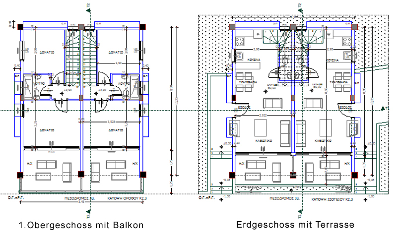 Die Häuser haben jeweils zwei Schlafzimmer, ein Bad und einen großen Balkon im Obergeschoss, sowie einen großen Wohnraum mit Ess-Bereich, Küche, Gäste-WC und Terrasse im Erdgeschoss.